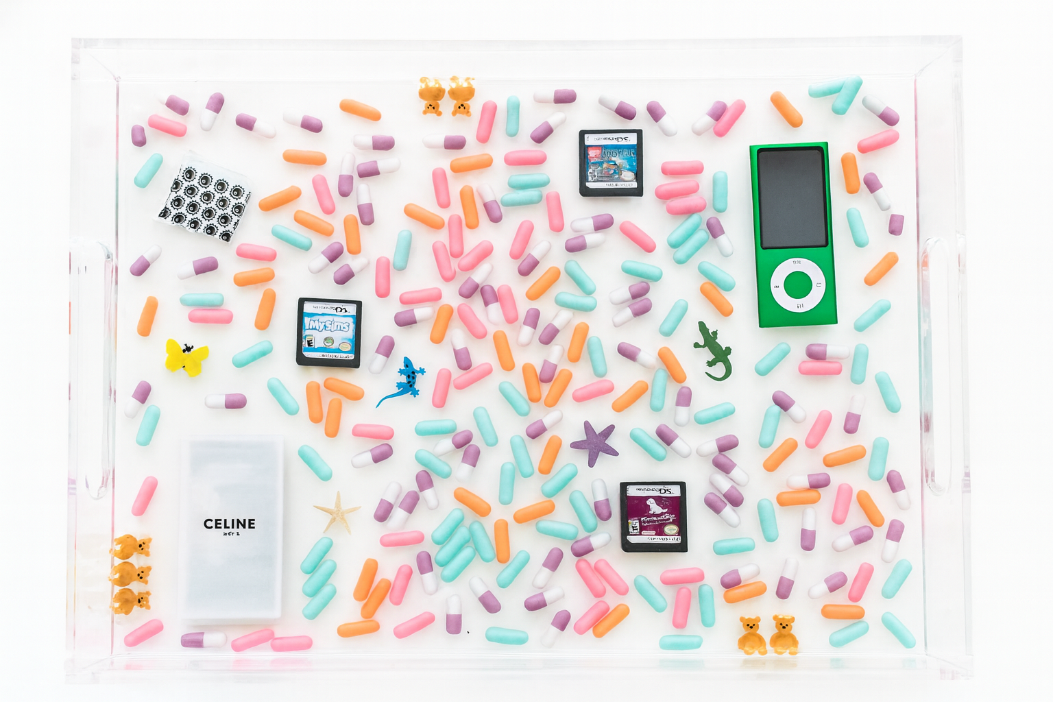 This serving tray encases objects from the early 2000s in clear resin, creating a functional time capsule. The objects were chosen carefully for their strong visual design and sense of nostalgia. Pastel-colored capsules are used as a repeated graphic element to introduce color and fill negative space. While they reference the aesthetics of early-2000s pop and nightlife, they also allude to the blurred boundary between diet culture and the emerging wellness culture of the time. Encased together, the objects reflect how ideas of excess, control, and self-optimization often coexisted visually during that period.