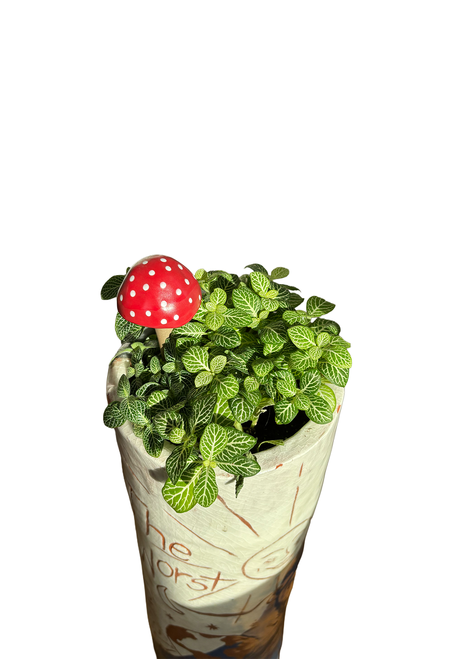 This planter began as a series of thrown cylinders, each shaped on the wheel at seven inches wide, then carefully stacked, attached, and refined into a single form. The surface was smoothed and painted with underglaze. The imagery was then carved out of the underglaze. The story wraps fully around the planter, encouraging it to be experienced differently from each angle rather than sequentially. It starts with an explosion and states “The Worst Invasive Species is Us.” The pictures show the effects of industry on nature, leading back into the image of the explosion.